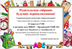 Родительское собрание состоится 13 марта в 17:00 в актовом зале Ордынской СОШ №2 по адресу ул.Октябрьская, 12